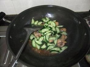 - 将切好的黄瓜条和红椒条、青椒条放入锅中,翻炒均匀。